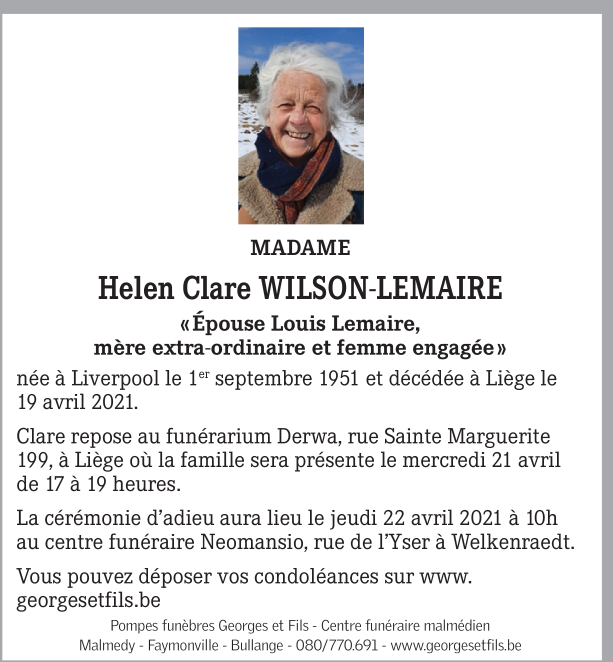 Décédée à Liège (4000) le lundi 19 avril 2021 à l'âge de 69 ans
