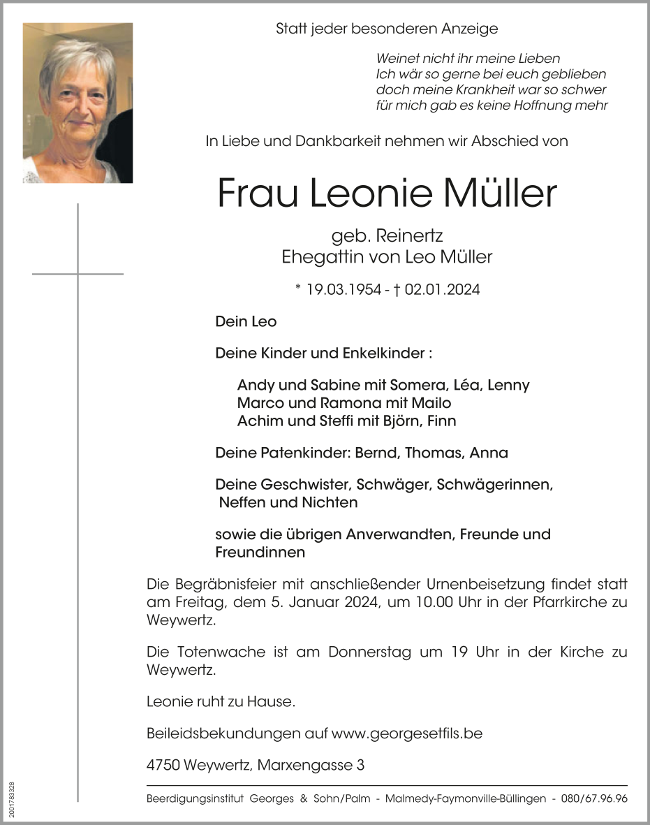 Décédée à Weywertz (4750) le mardi 2 janvier 2024 à l'âge de 69 ans
