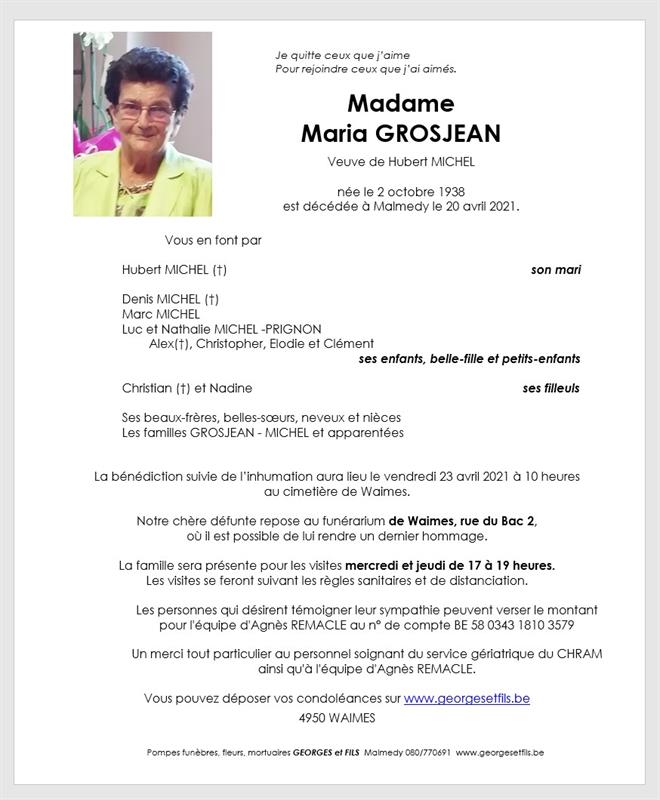 Madame Maria GROSJEAN veuve de Hubert MICHEL