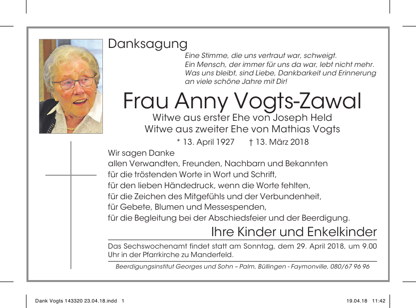 Décédée à Saint-Vith (4780) le mardi 13 mars 2018 à l'âge de 90 ans