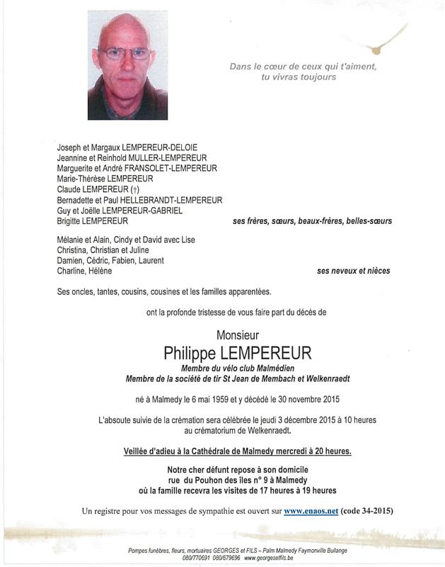 Décédé à Malmedy (4960) le lundi 30 novembre 2015 à l'âge de 56 ans