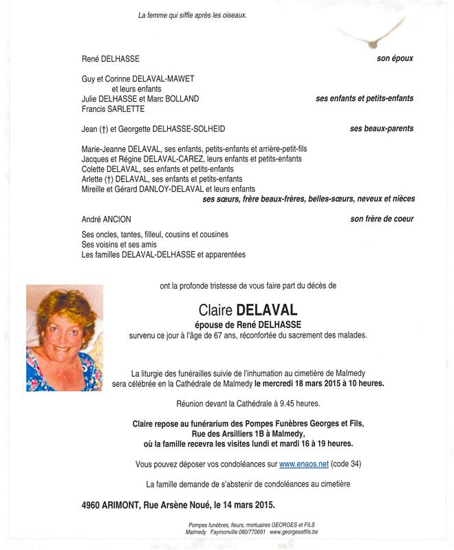 Décédée à Arimont (4960) le samedi 14 mars 2015 à l'âge de 67 ans