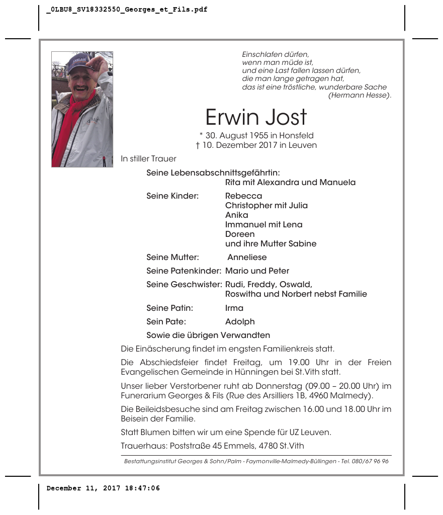 Décédé à Leuven (3000) le dimanche 10 décembre 2017 à l'âge de 62 ans