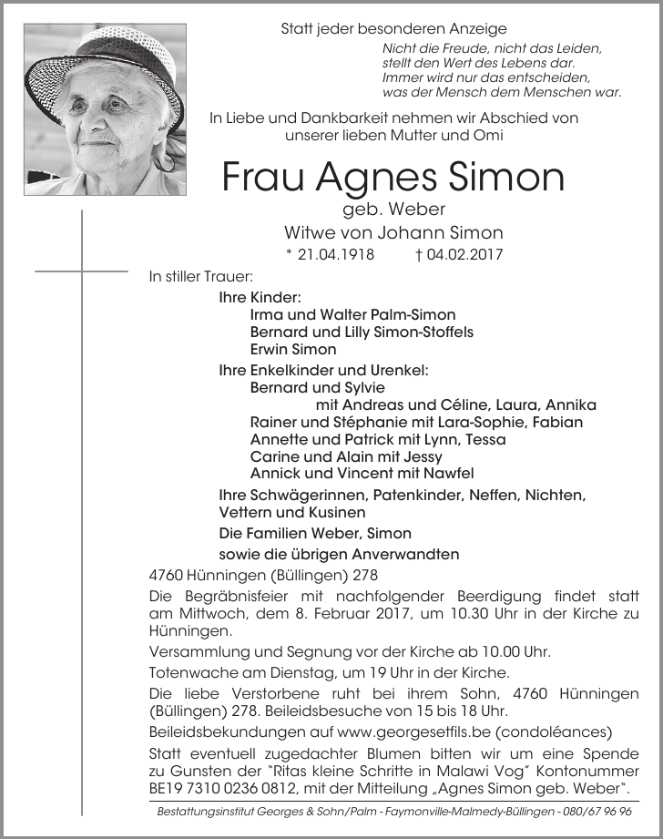 Décédée à Bütgenbach (4750) le samedi 4 février 2017 à l'âge de 98 ans